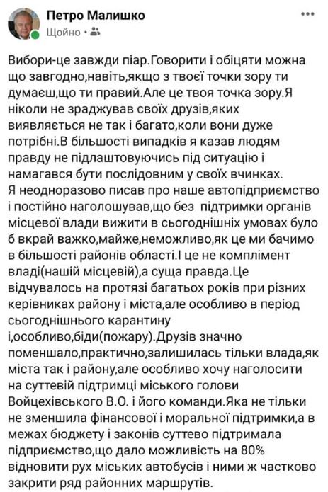 – Я неодноразово писав про наше підприємство і постійно наголошував, що без підтримки органів місцевої влади вижити сьогодні було б вкрай важко. Майже неможливо, що й бачимо в більшості районах області. І це не комплімент владі (місцевій), а цілковита правда. Це відчувалось протягом багатьох років при різних керівниках району і міста, але особливо в період карантину і біди – пожежі. Друзів значно поменшало, фактично залишилась тільки влада, як міста так і району. Але особливо хочу наголосити на підтримці міського голови і його команди. Яка в межах бюджету і законів суттєво підтримала підприємство, що дало можливість на 80% відновити рух міських автобусів і ними ж частково закрити питання ряду районних маршрутів. Друзів я не зраджую, але сьогодні я підтримую Віталія Войцехівського, – зазначив Малишко.