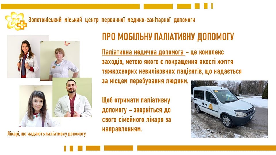 У Золотоніському центрі сімейної медицини розпочали працювати мобільні бригади з надання паліативної медичної допомоги. Це – комплекс заходів, спрямованих на покращення якості життя пацієнтів, які мають тяжкі інвалідизуючі чи невиліковні хвороби. Основна задача паліативної допомоги – полегшення фізичних, психологічних та духовних страждань пацієнта, а також допомога його близьким у догляді.